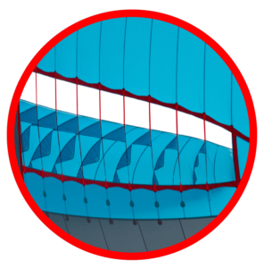Az önfelfúvódó két rétegű szárny metszete. A szárny a belsejében lévő levegővel úgy működik mint egy puha latni, mely az oldalélek között stabilizálja a vitorlát.